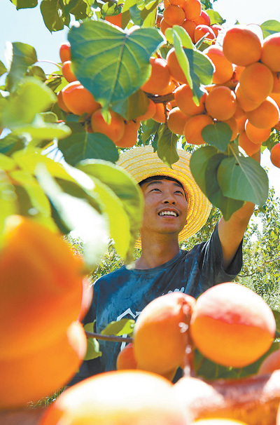 甘肅省張掖市臨澤縣倪家營鎮(zhèn)黃家灣村,游客在果園里采摘大黃杏。臨澤縣種植14.7萬畝林果經濟苗木,成為當?shù)剞r戶增收的重要渠道。王將攝(人民視覺)