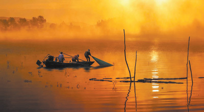 吉林省遼源市東豐縣龍頭水庫,漁民在晨曦中捕魚。石勝華攝(人民視覺)