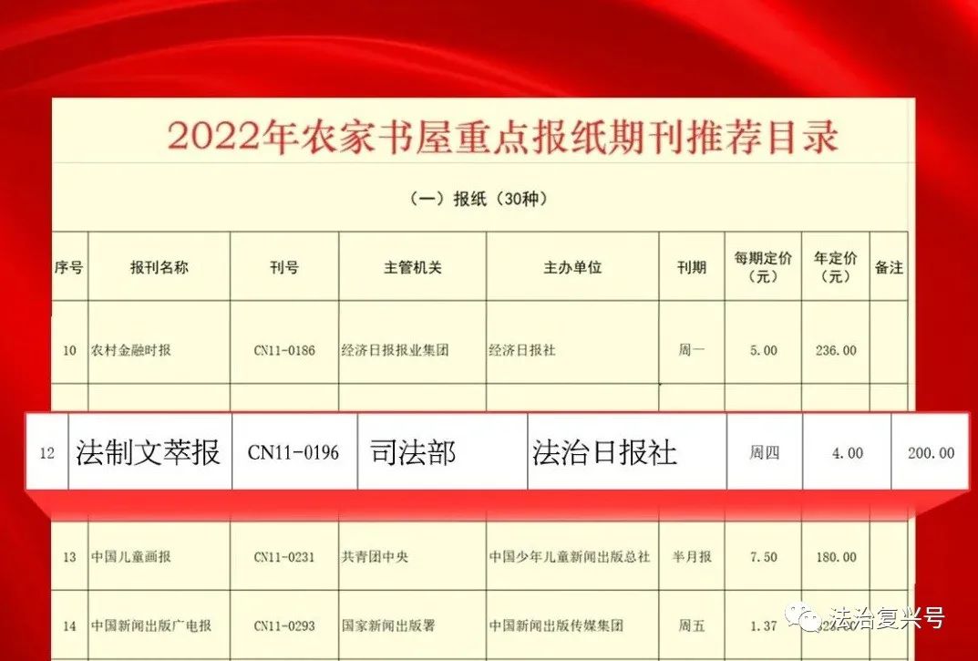 近日,經(jīng)中央宣傳部組織專(zhuān)家評(píng)審,《法制文萃報(bào)》成功入選《2022年農(nóng)家書(shū)屋重點(diǎn)出版物推薦目錄》,成為該目錄中唯一一份法治類(lèi)報(bào)紙。