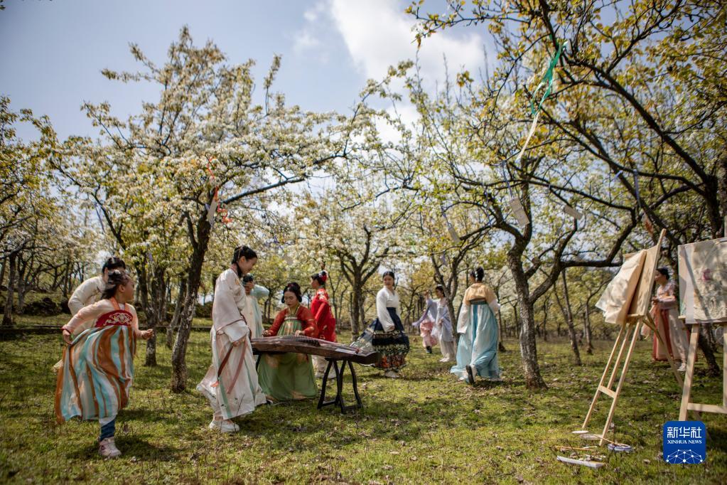 4月1日,幾名古裝愛好者穿著古裝在秀山縣溶溪鎮(zhèn)梨園村梨園內嬉戲。胡程 攝