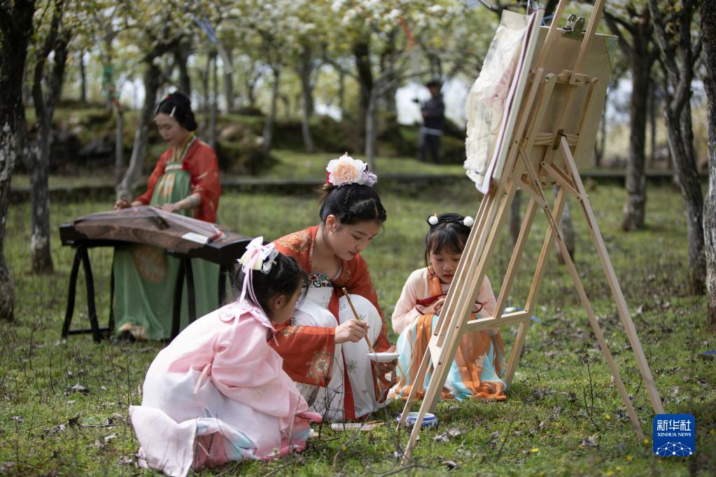 4月1日,一名古裝愛好者穿著古裝在秀山縣溶溪鎮(zhèn)梨園村梨樹下教小朋友畫畫。胡程 攝
