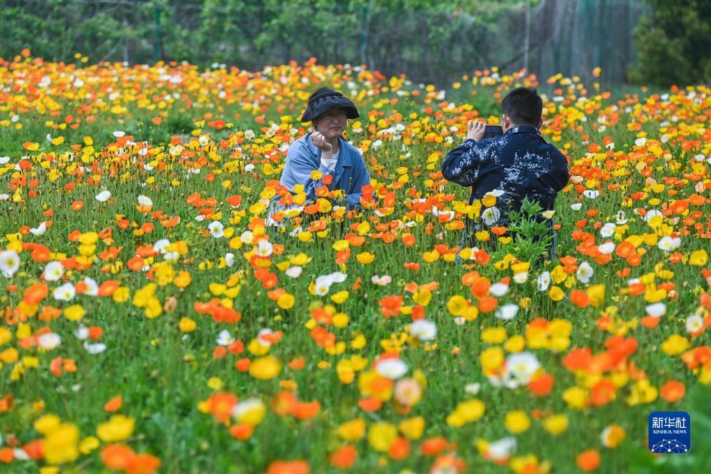 4月11日,游客在織里鎮(zhèn)廟兜村的花海中拍照留影。記者 徐昱 攝