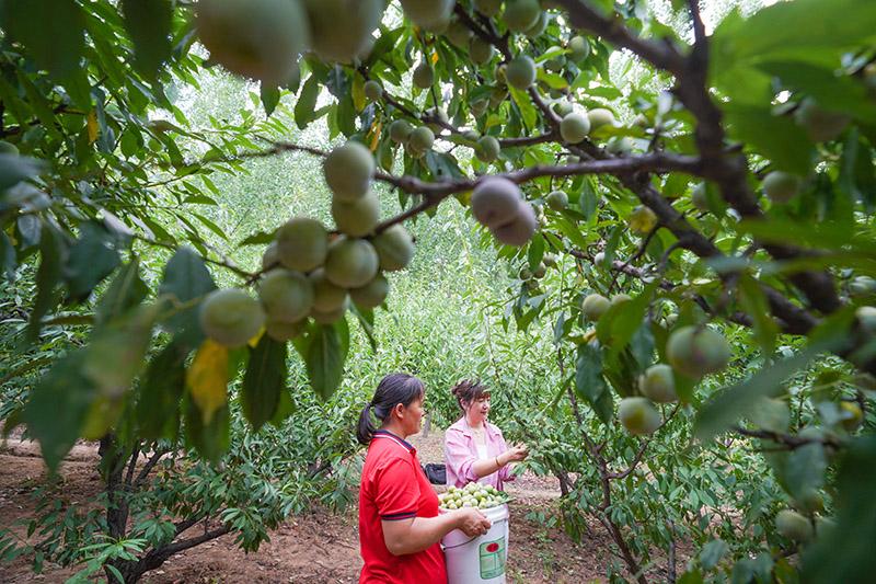 7月6日,山東省鄒平市西董街道南洞村的青李聯(lián)合農(nóng)場(chǎng),游客和果農(nóng)在采摘青李。