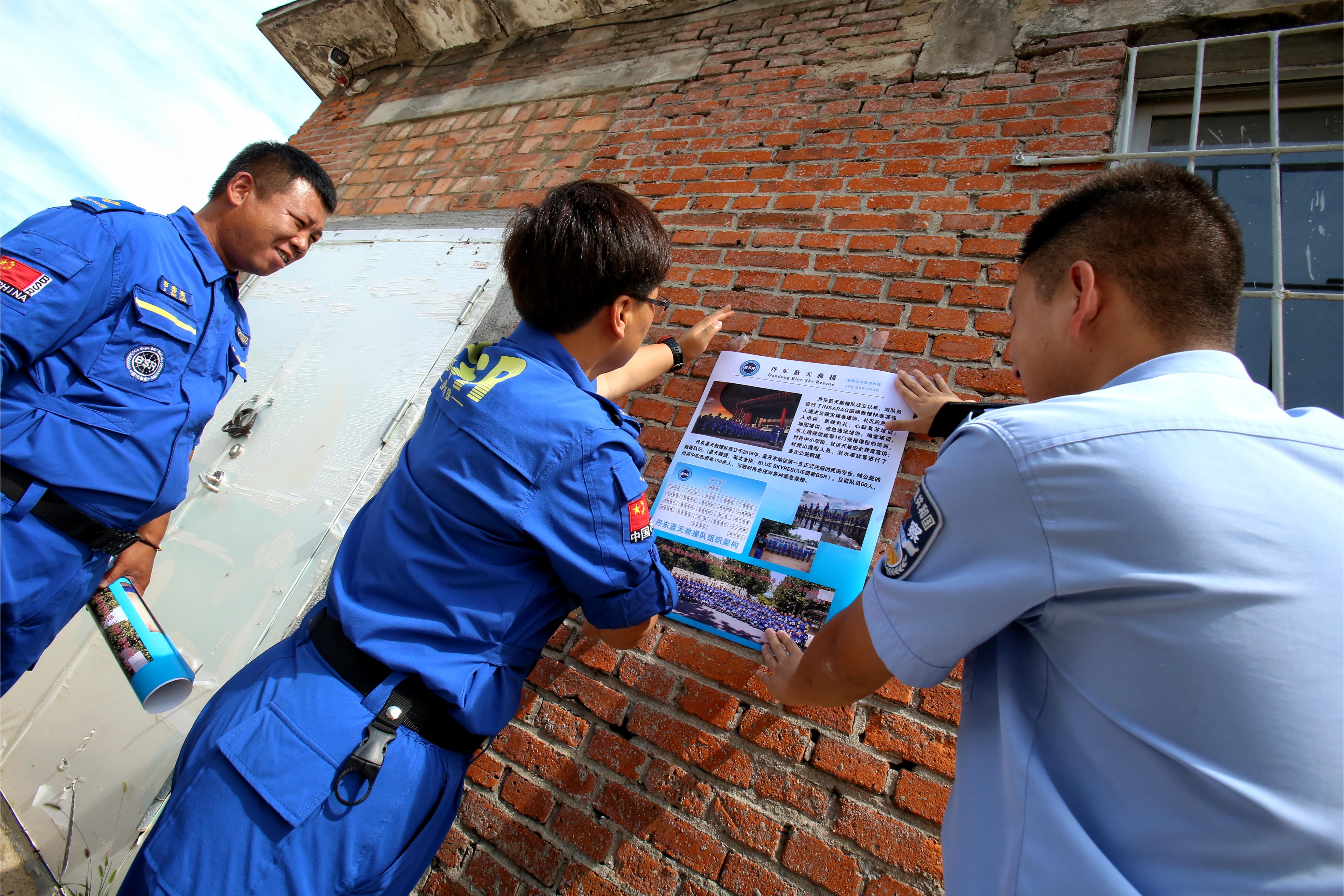民警與救援隊(duì)隊(duì)員共同張貼宣傳海報(bào)