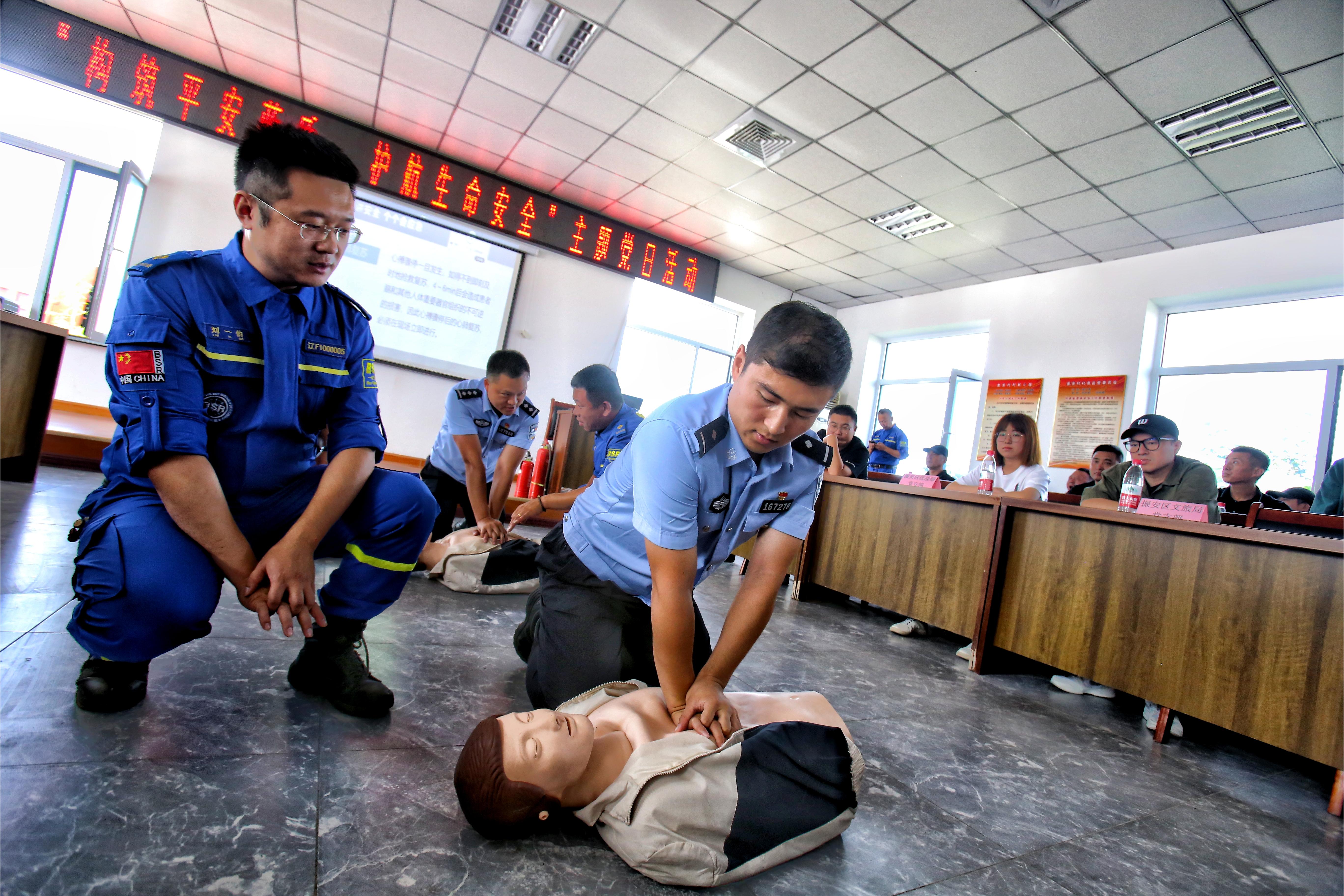 簽約儀式后,丹東藍(lán)天救援隊(duì)現(xiàn)場為120余名骨干黨員開展了應(yīng)急救護(hù)知識(shí)專題培訓(xùn),隊(duì)員們通過理論知識(shí)講解、現(xiàn)場演示、互動(dòng)教學(xué)等方式,以生活中發(fā)生頻率較高的突發(fā)意外為例,生動(dòng)形象地講解了腦梗、心梗、昏迷、休克、中暑、低血糖等急性癥狀發(fā)作時(shí)的急救措施,重點(diǎn)對(duì)腹部沖擊法心肺復(fù)蘇術(shù)、止血包扎、溺水、抽筋、氣道異物梗阻的搶救技巧,以及心臟按壓的基本原理和操作流程等內(nèi)容進(jìn)行講解,并通過互動(dòng)式實(shí)操演練,現(xiàn)場指導(dǎo)要領(lǐng)、糾正方法,確保在場的民警和群眾真正掌握急救技能。