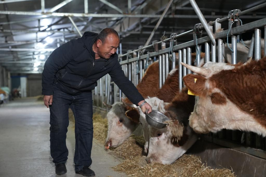 格其葉樂圖在牛棚里給牛投喂顆粒飼料(受訪者供圖)