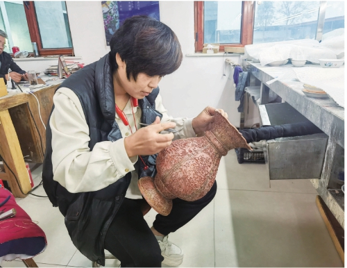 近日,饒陽(yáng)縣億澤景泰藍(lán)工藝品廠內(nèi),脫貧群眾正在為景泰藍(lán)填充色釉(資料圖)