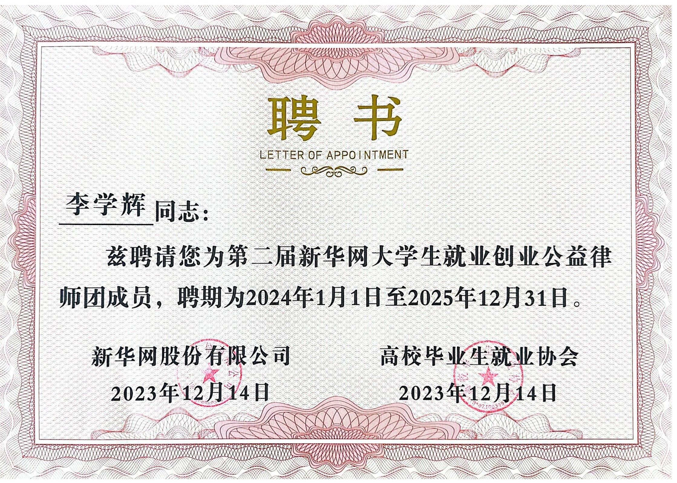 北京市安理律師事務所黨委副書記、管委會委員李學輝律師憑借扎實的法律功底、過硬的專業(yè)素養(yǎng)、應有的責任擔當,受聘擔任新華網大學生就業(yè)創(chuàng)業(yè)公益律師團成員。