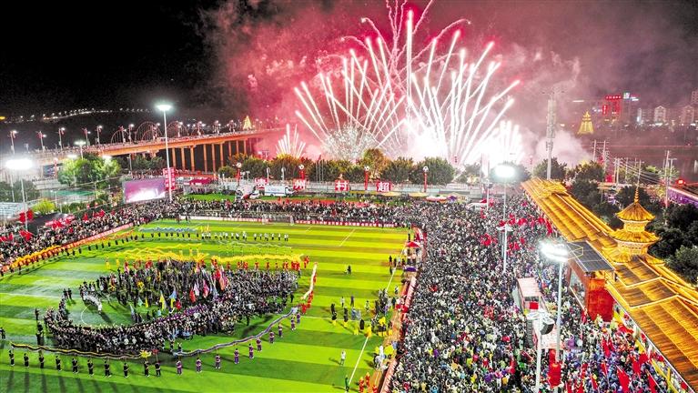 19時(shí)30分,澳門職工聯(lián)隊(duì)與貴州村超聯(lián)隊(duì)友誼賽結(jié)束后,“村超村晚”文藝展示又將整場(chǎng)活動(dòng)推向高潮。這場(chǎng)晚會(huì)由民風(fēng)民俗展新顏、鄉(xiāng)村足球超快樂(lè)、貴山貴水迎貴客、龍騰盛世慶豐年4個(gè)篇章組成,參演演員近2300人。據(jù)相關(guān)負(fù)責(zé)人介紹,此次文藝展示的內(nèi)容均以榕江“村超”自創(chuàng)節(jié)目為主,同時(shí),澳門舞醉龍表演隊(duì)在龍騰盛世慶豐收環(huán)節(jié)與貴州的舞龍隊(duì)伍共同演出,展示出兩地文化的互通互融。本次文藝展示強(qiáng)調(diào)“草根”和民族文化,吸引了上萬(wàn)人現(xiàn)場(chǎng)觀看,在演出的尾聲,一場(chǎng)持續(xù)10余分鐘的煙花秀點(diǎn)亮了榕江縣的夜空,“文化味、民族味、傳承味、年味”十足的“村超村晚”在觀眾和游客的掌聲與歡呼聲中落下帷幕。