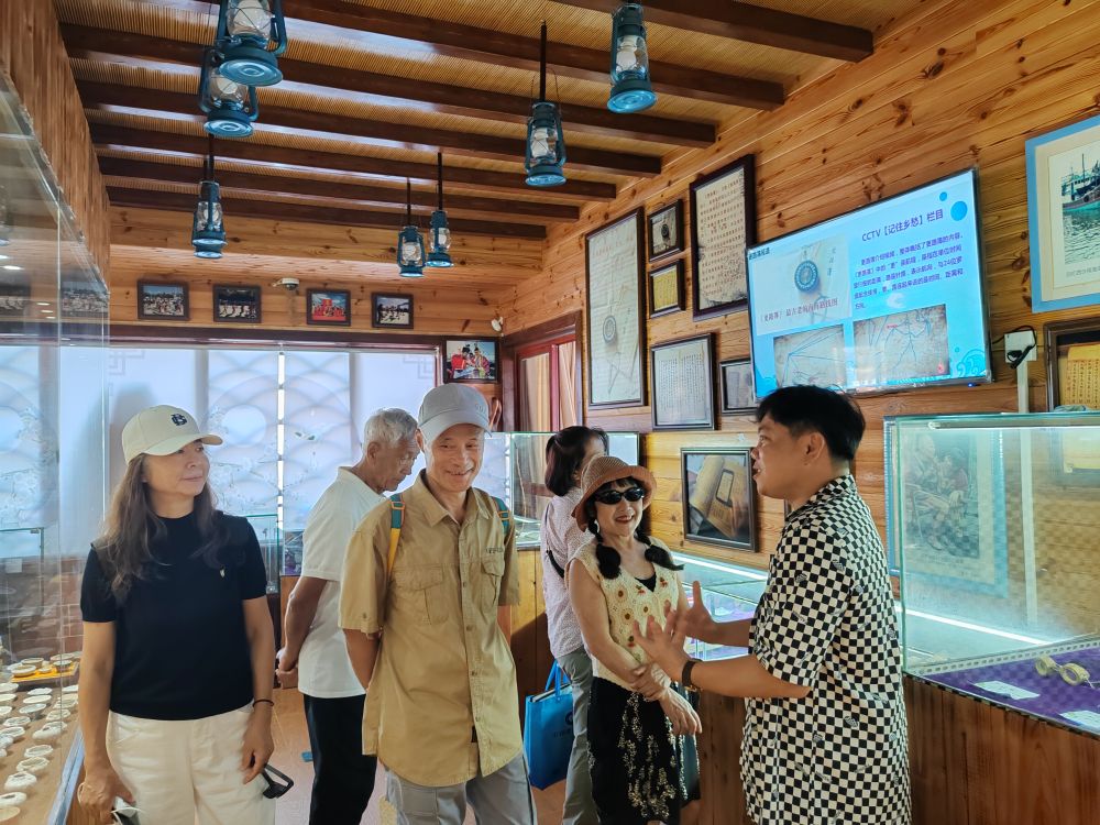 在潭門鎮(zhèn)排港村更路簿博物館,館長(zhǎng)王振忠正在為游客講述潭門老漁民的故事 記者 夏天 攝