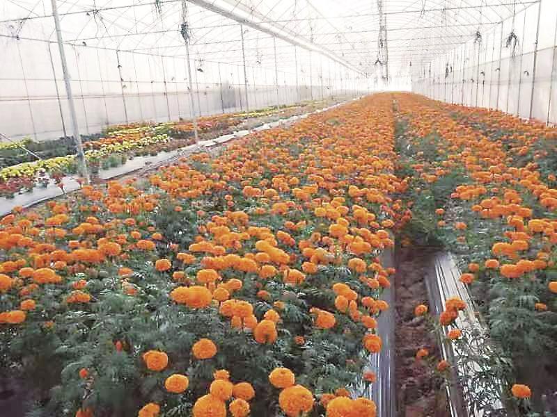 在農(nóng)安縣三盛玉鎮(zhèn)三盛玉村的花卉大棚內(nèi),滿(mǎn)是準(zhǔn)備移栽的萬(wàn)壽菊(資料圖片)