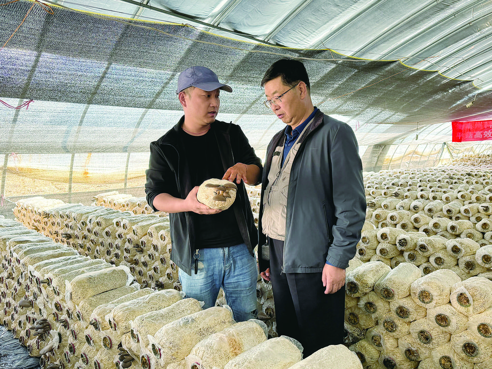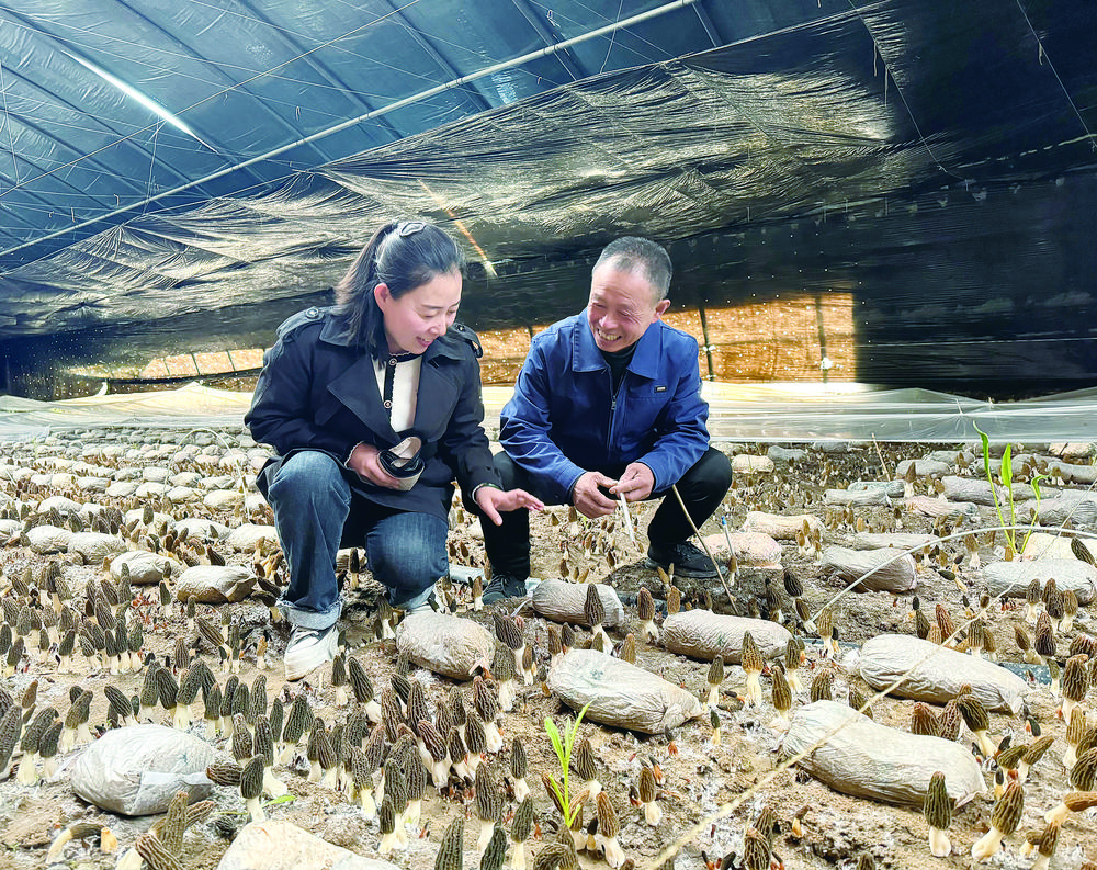 科技特派員王亞藝正和土專家丁勇檢查試種羊肚菌的品質(zhì) 記者 王臻 攝