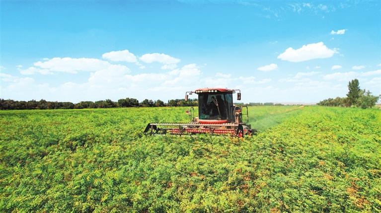 但見地里的苜蓿有高有低、呈波浪狀?!澳闱?,我們農(nóng)場(chǎng)進(jìn)行植株高低搭配,將個(gè)頭較高的WJ363HK苜蓿與個(gè)頭低的阿蒂娜間作套種,當(dāng)苜蓿大面積開花時(shí),能充分享受陽(yáng)光,提高苜蓿牧草的粗蛋白含量?!壁w富強(qiáng)說(shuō)著算了一筆賬:今年6月10日到20日,頭茬苜蓿成熟,19臺(tái)大型機(jī)械搶趕時(shí)間,一個(gè)多星期就收割結(jié)束,保障了粗蛋白含量高達(dá)20%以上;目前第二茬苜蓿只有40厘米高,長(zhǎng)到7月下旬80厘米左右即可收割;第三茬苜蓿到9月中下旬時(shí)收割。1畝苜蓿收割3茬、可產(chǎn)900公斤至1噸干草,按照目前市場(chǎng)價(jià)1噸干草1600至1800元計(jì)算,收益可觀。
