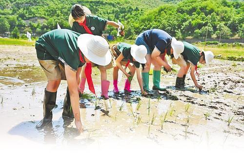 7月20日,井陘縣南峪村,參加農(nóng)耕研學(xué)活動的學(xué)生正在稻田插秧 記者 張曉超 攝
