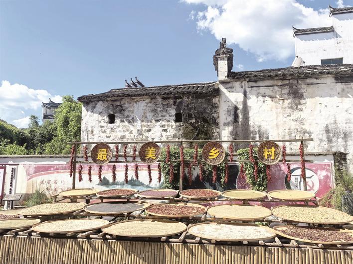 在石門村,自然風(fēng)光與文化底蘊(yùn)交相輝映。村內(nèi)廣場(chǎng)上,一排排曬盤盛滿了紅豆、玉米、辣椒等農(nóng)產(chǎn)品,展現(xiàn)了婺源人傳統(tǒng)的曬秋習(xí)俗。