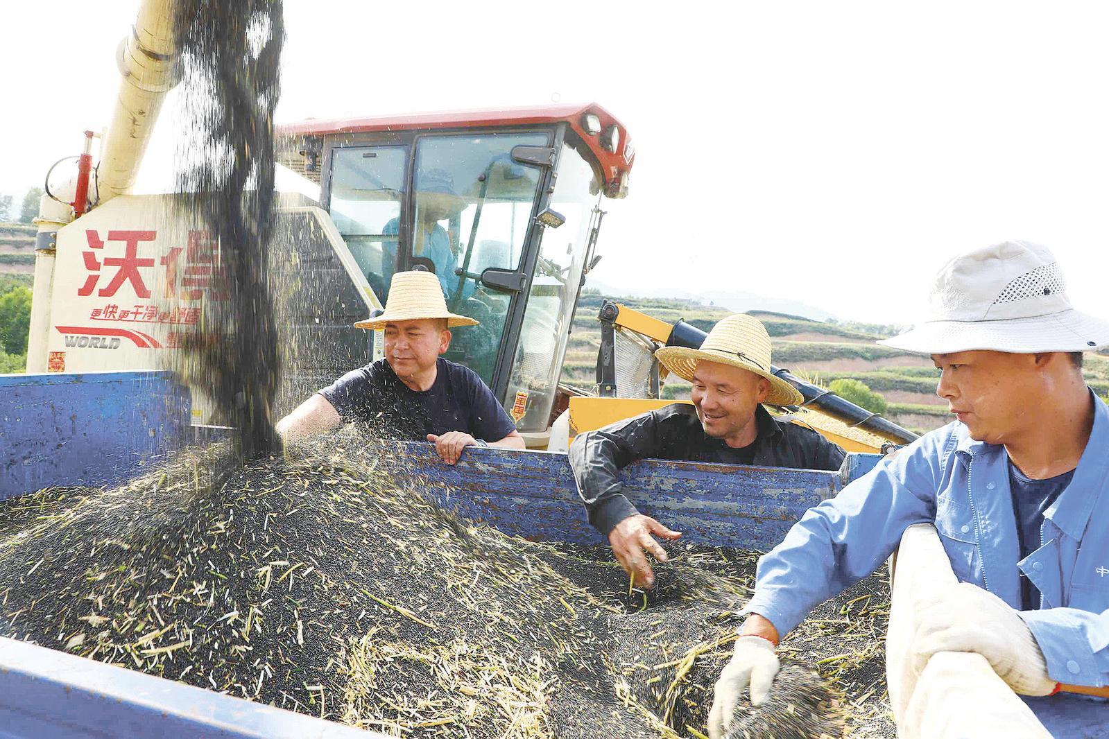 在一處坡洼的田塊里,一臺(tái)聯(lián)合收割機(jī)正在卸糧,收獲的油菜籽從卸糧口傾瀉而下,倒入三輪車斗里。“這塊田以前是撂荒地,我們合作社流轉(zhuǎn)后種植了油菜。今年雨水好,看莊稼長(zhǎng)勢(shì),油菜籽畝均產(chǎn)量至少在150公斤以上?!睆埣仪f村黨支部書記張斌先和村支部委員寧智祥捧起一把黑黝黝的油菜籽,臉上露出收獲的喜悅。