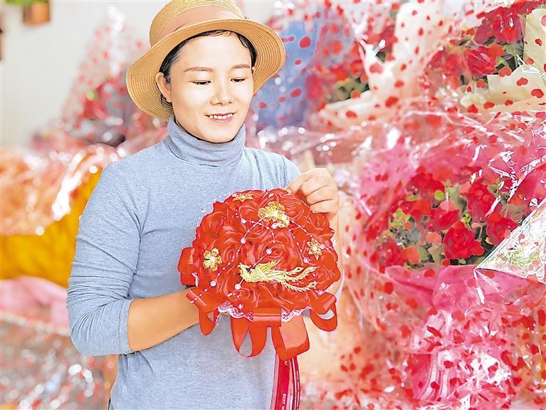 馬東花在自家新開的鮮花坊展示自制的手捧花
