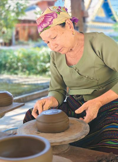 在景萊村的一處木亭里,63歲的玉相論正垂目凝神、轉(zhuǎn)動(dòng)拉坯轉(zhuǎn)輪,一個(gè)普通的陶坯在她手下逐漸變身為帶有壺嘴的陶罐。玉相論43歲才開始學(xué)習(xí)傣族慢輪制陶技藝,現(xiàn)在她是西雙版納州級(jí)非遺傳承人?!鞍阎铺盏姆椒▊飨氯?,也是把傣家人的生活方式傳下去。”玉相論說(shuō)。