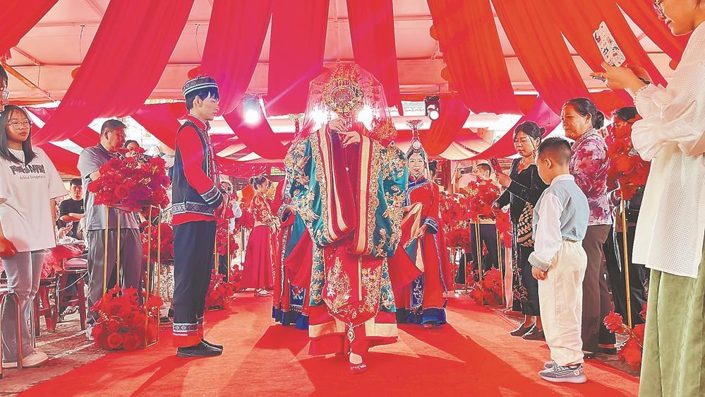 永定土樓景區(qū)在“土樓有喜”劇場(chǎng)內(nèi)開(kāi)展客家婚俗表演(永定區(qū)融媒體中心供圖)