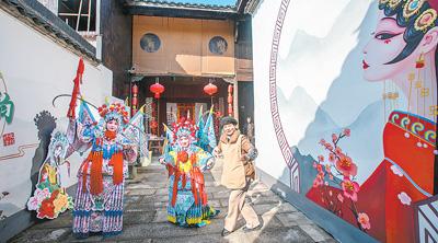 在浙江省金華市鄭店村婺劇非遺主題館,村劇團(tuán)老師給游客指導(dǎo)婺劇基本動作。楊梅清 攝