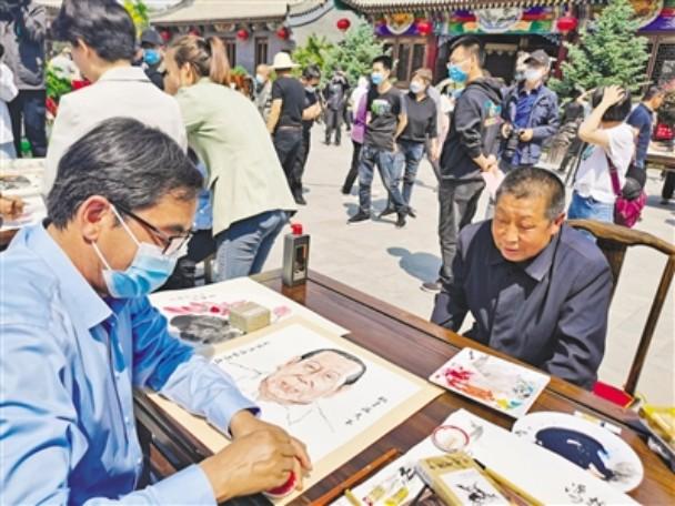 “畫畫我們村的‘明星’”活動(dòng)中,書畫家為村民畫像