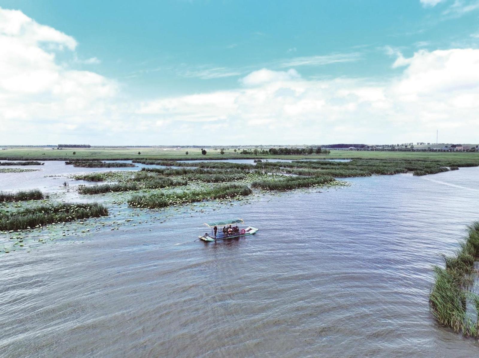 藍天白云下,查干湖湖水廣闊浩渺,一條小船悠然穿行其中,盡顯查干湖自然之美與寧靜祥和。
