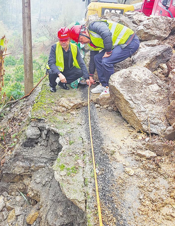 3月14日,秭歸縣芝茅公路,保險(xiǎn)公司工作人員在災(zāi)毀路段進(jìn)行查勘核災(zāi)。記者 柯皓 通訊員 王耿 攝