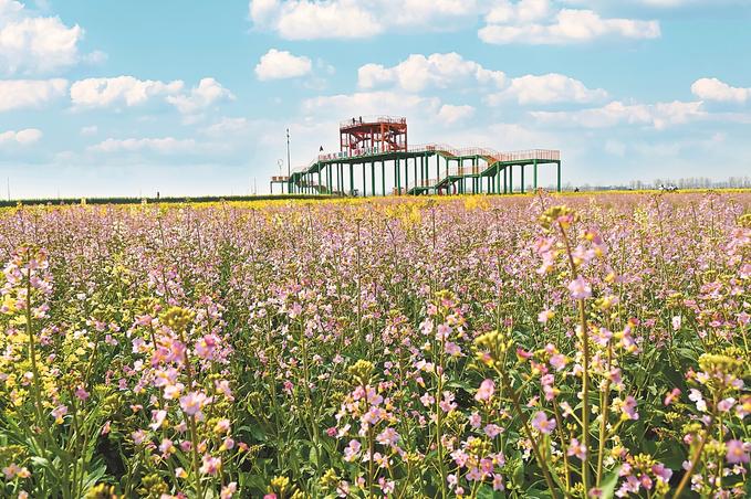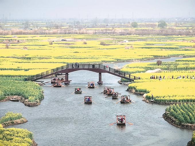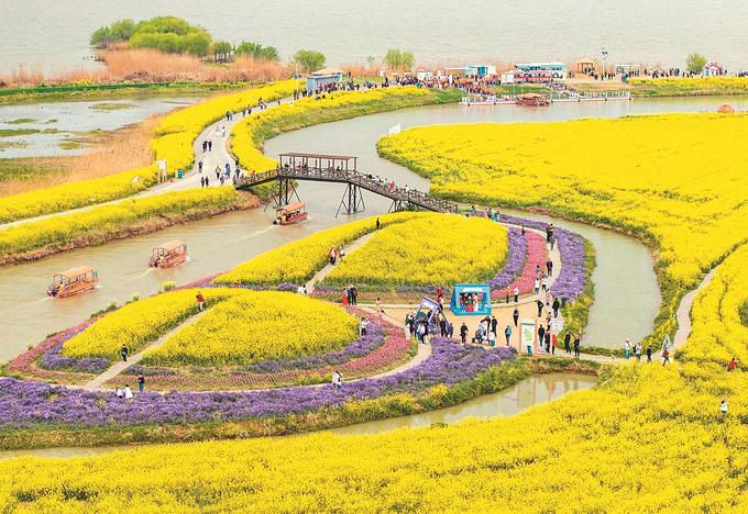 在蘇中,興化、高郵、如皋三市都不約而同“偏愛”油菜花。在興化千垛景區(qū),萬畝垛田花海演繹“河有萬灣多碧水,田無一垛不黃花”;在高郵湖上花海,“半城花海半城詩”的獨特景觀,吸引了眾多游客;在如皋平園池村,五彩油菜花好似打翻春日“調色盤”……