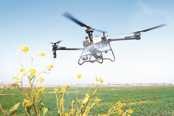 在省農(nóng)墾三河農(nóng)場(chǎng)邱上營(yíng)分場(chǎng)的麥田里,植保無(wú)人機(jī)進(jìn)行飛防作業(yè)。顏懷峰 錢厚紅 攝