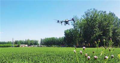 薊州區(qū)侯家營鎮(zhèn)王家堡村高標(biāo)準(zhǔn)農(nóng)田,無人機在執(zhí)行噴施作業(yè)。