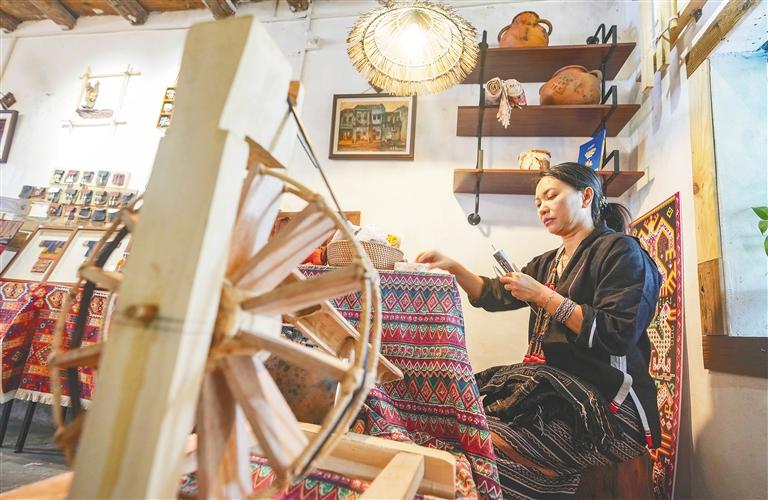 東方市八所鎮(zhèn)北黎村,村民在店內(nèi)織錦。記者 陳元才 攝