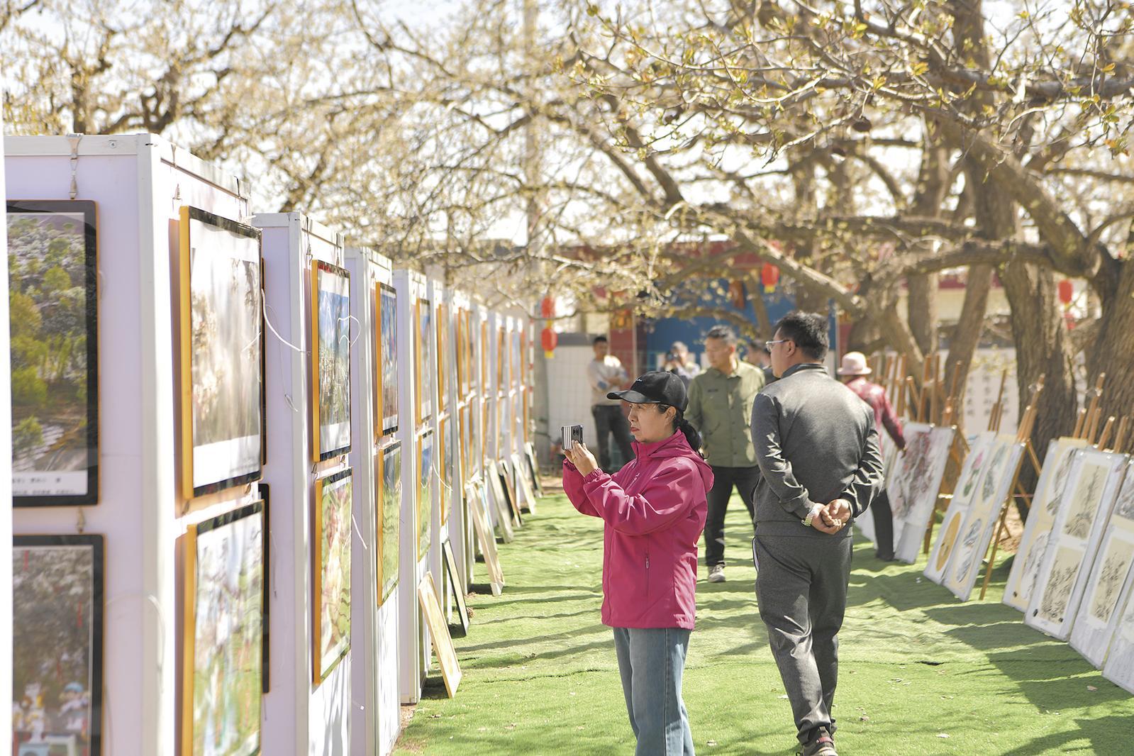 今年的橋頭村很不一樣,不僅增設(shè)了停車場(chǎng),多了很多“新”攤位,進(jìn)入梨園的道路兩旁還增加了“哪吒鬧春”國潮打卡彩繪墻。游客一路賞梨花、拍照,就來到了梨園。精心裝扮后的梨樹古色古香,樹下設(shè)置了賞花品茗休憩點(diǎn),坐滿了欣賞表演的游客,還有“梨園春色”主題攝影藝術(shù)展,供游客賞梨花之美、品人文之韻。
