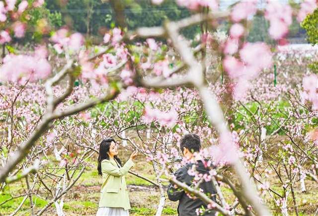 銅梁區(qū)圍龍鎮(zhèn)龍湖村水蜜桃基地,桃花盛開吸引游客拍照留影(攝于3月21日)。記者 龍帆 攝