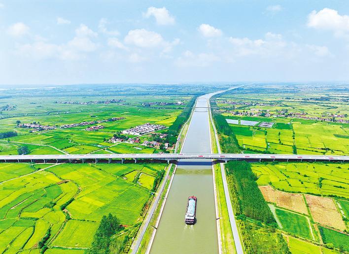 江漢運(yùn)河荊門市沙洋縣李市鎮(zhèn)至后港鎮(zhèn)段,運(yùn)河、橋梁、稻田交相輝映。