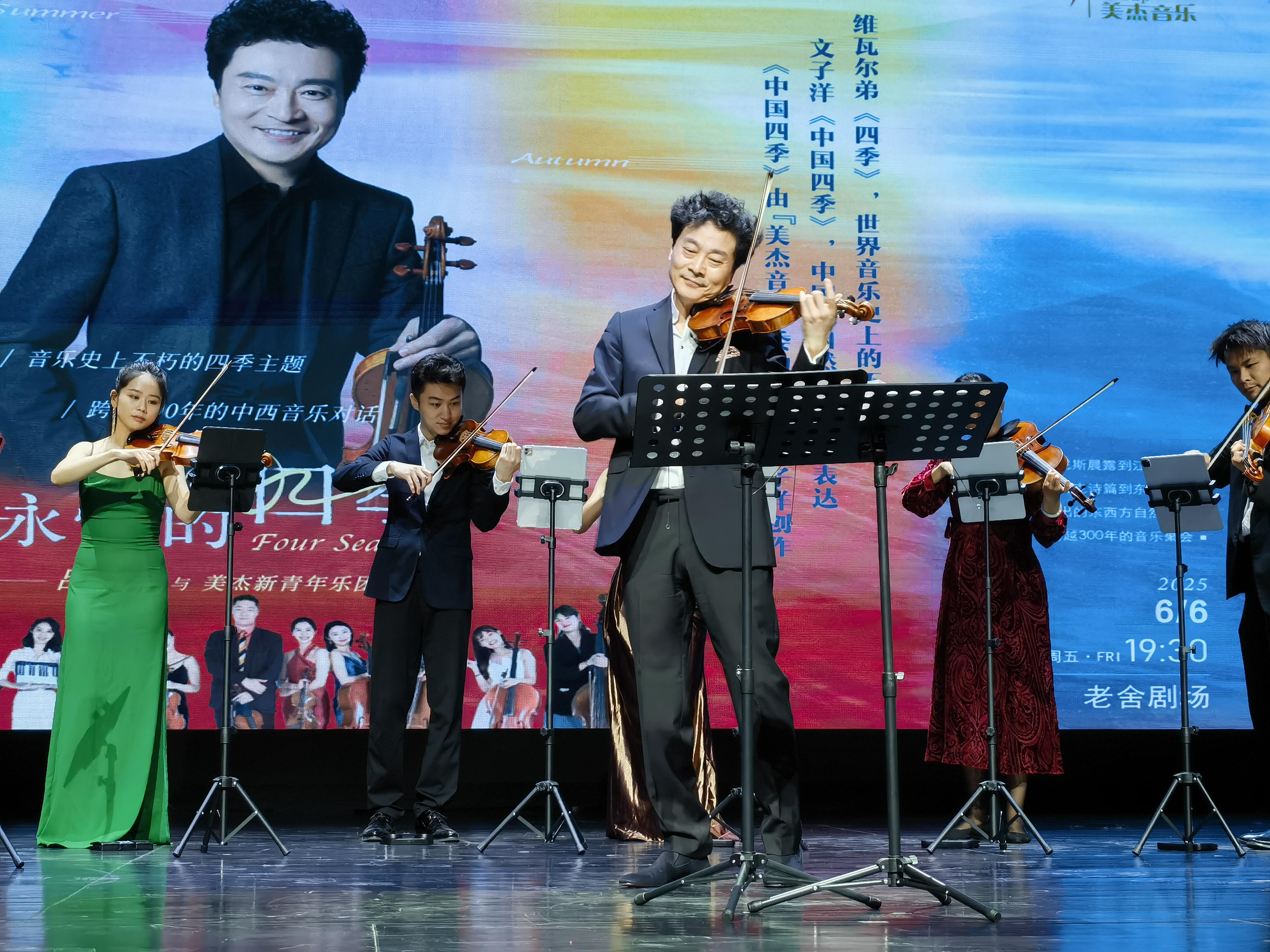 “和著飛快不息的音樂(lè)節(jié)拍,四季蹁躚而來(lái),飄然而去——色彩、旋律、芳香匯成不竭的瀑布傾瀉而下,時(shí)刻在豐沛的歡樂(lè)中飛濺、墜落、消亡”。這是印度詩(shī)人泰戈?duì)栐谄浍@得諾貝爾文學(xué)獎(jiǎng)的詩(shī)集《吉檀迦利》中發(fā)出的感喟。6月6日,適逢二十四節(jié)氣里唯一直接指導(dǎo)農(nóng)事活動(dòng)的芒種——“忙種”期間,筆者在北京老舍劇場(chǎng)觀賞《永恒的四季——呂思清與美杰新青年樂(lè)團(tuán)音樂(lè)會(huì)》,對(duì)詩(shī)人之榮枯慨嘆越發(fā)感同身受。是的,和著節(jié)拍,四季蹁躚若何,泰戈?duì)柕脑?shī)意,或許是對(duì)足以代言中國(guó)新聲音活力前沿的“美杰”版《四季》最好的詮釋。