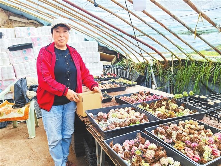 “瞧這些多肉植物小巧可愛,讓城里人親近大自然吧,網(wǎng)上賣得很火?!贝迕駨埵缬⑦叴虬b邊說,“通常老板們上午直播帶貨,下午我們就按照貨單挑貨、抖土、晾干,再裝貨,保持多肉植物不爛根。平時(shí)打理好這些植物,活很輕松,月收入2800元,還能兼顧種好家里5畝地?!?/p>
