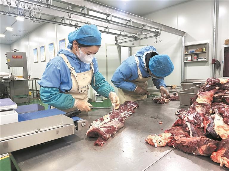“一只成年藏羊在經(jīng)過檢疫達(dá)標(biāo)屠宰后,先送至排酸間用保鮮排酸技術(shù)進(jìn)行排酸,再被送進(jìn)這里分割加工、剔骨、修割。”仟戶牧場加工車間工作人員馬玉梅介紹說。只見她手持專用刀具,沿著羊肉的肌肉紋理精準(zhǔn)下刀,將藏羊按部位分割成精品羊肋排、羊腿肉(帶骨)、羊脖片等不同區(qū)塊。隨后,新鮮的藏羊肉被快速分揀至不同區(qū)域,有的進(jìn)入真空包裝機(jī)完成封裝,有的則被送往進(jìn)一步加工的流水線。車間里機(jī)器運(yùn)轉(zhuǎn)的低鳴聲與工作人員專注的動(dòng)作交織,每一個(gè)環(huán)節(jié)都嚴(yán)格遵循衛(wèi)生標(biāo)準(zhǔn),確保肉類從分割到成品的全程安全。