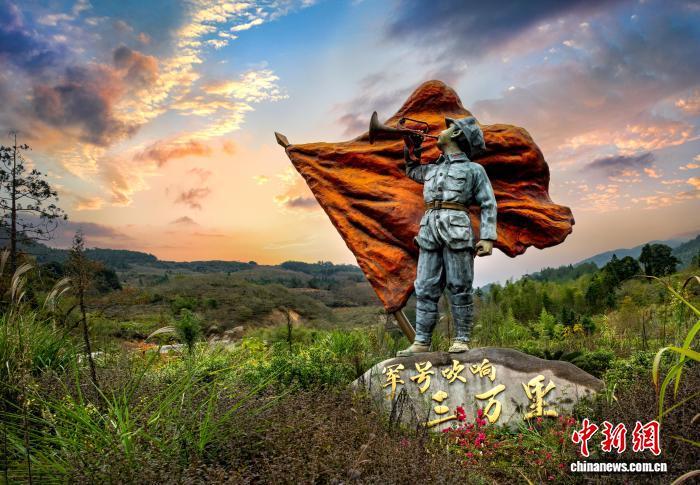 三萬(wàn)里村的“軍號(hào)吹響三萬(wàn)里”雕塑。(屏南縣路下鄉(xiāng)人民政府供圖)