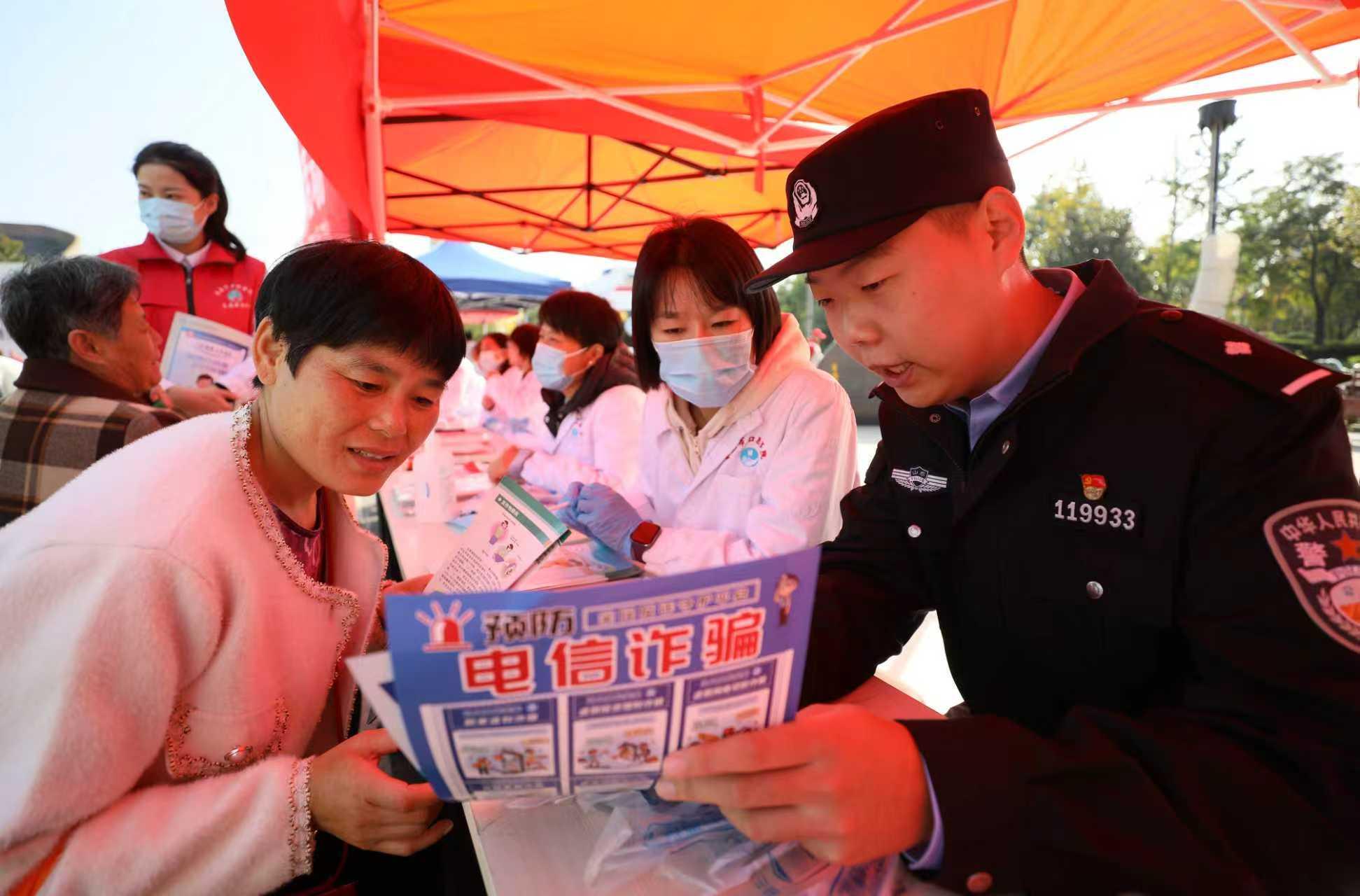 10月29日,在山東省棗莊市臺兒莊區(qū)興中廣場,民警在向前來義診的市民普及防范電信網(wǎng)絡(luò)詐騙知識。當(dāng)日是農(nóng)歷九月初九,2025年棗莊市暨臺兒莊區(qū)“敬老月”重陽節(jié)健康義診活動在此舉行,在做好為廣大居民義診的同時,臺兒莊區(qū)衛(wèi)生健康局邀請臺兒莊公安分局反詐民警,向前來義診的市民發(fā)放防范電信網(wǎng)絡(luò)詐騙宣傳彩頁,普及相關(guān)知識,告訴大家在就醫(yī)就診過程中要切實(shí)提高電信網(wǎng)絡(luò)詐騙防范意識。(山東省棗莊市公安局臺兒莊分局 張嚴(yán)新)