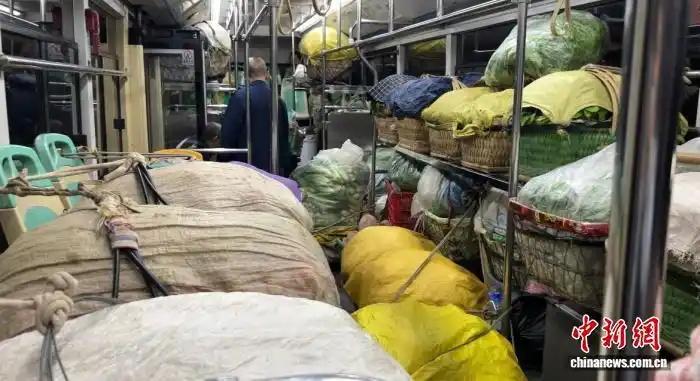 圖為菜農將蔬菜等搬上公交車。楊凱茗 攝