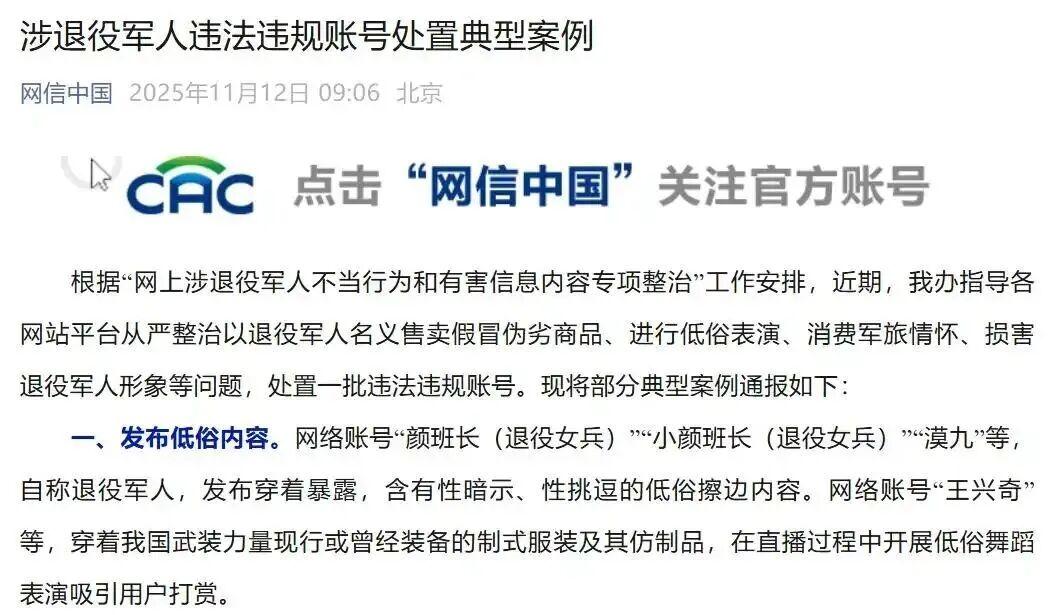 日前,中央網(wǎng)信辦通報一批涉退役軍人違法違規(guī)賬號處置典型案例,“顏班長(退役女兵)”“宋班長(正能量)”等一批以退役軍人名義售賣假冒偽劣商品、進行低俗表演、傳播虛假信息等損害軍人軍隊形象的違法違規(guī)賬號被依法查處。