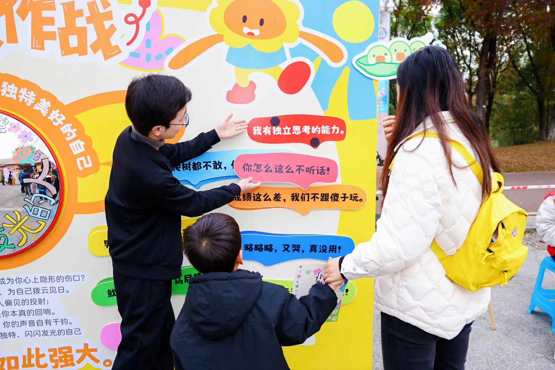 “愛(ài)的加油站”具象地展示了對(duì)抗暴力最柔軟的方式是愛(ài)。在“夸夸挑戰(zhàn)區(qū)”,不管是親子、情侶還是朋友,大家面對(duì)面真誠(chéng)贊美、溫暖擁抱。直接的情感流動(dòng),讓每個(gè)人都感受到了人際關(guān)系中的安全感與支持力。