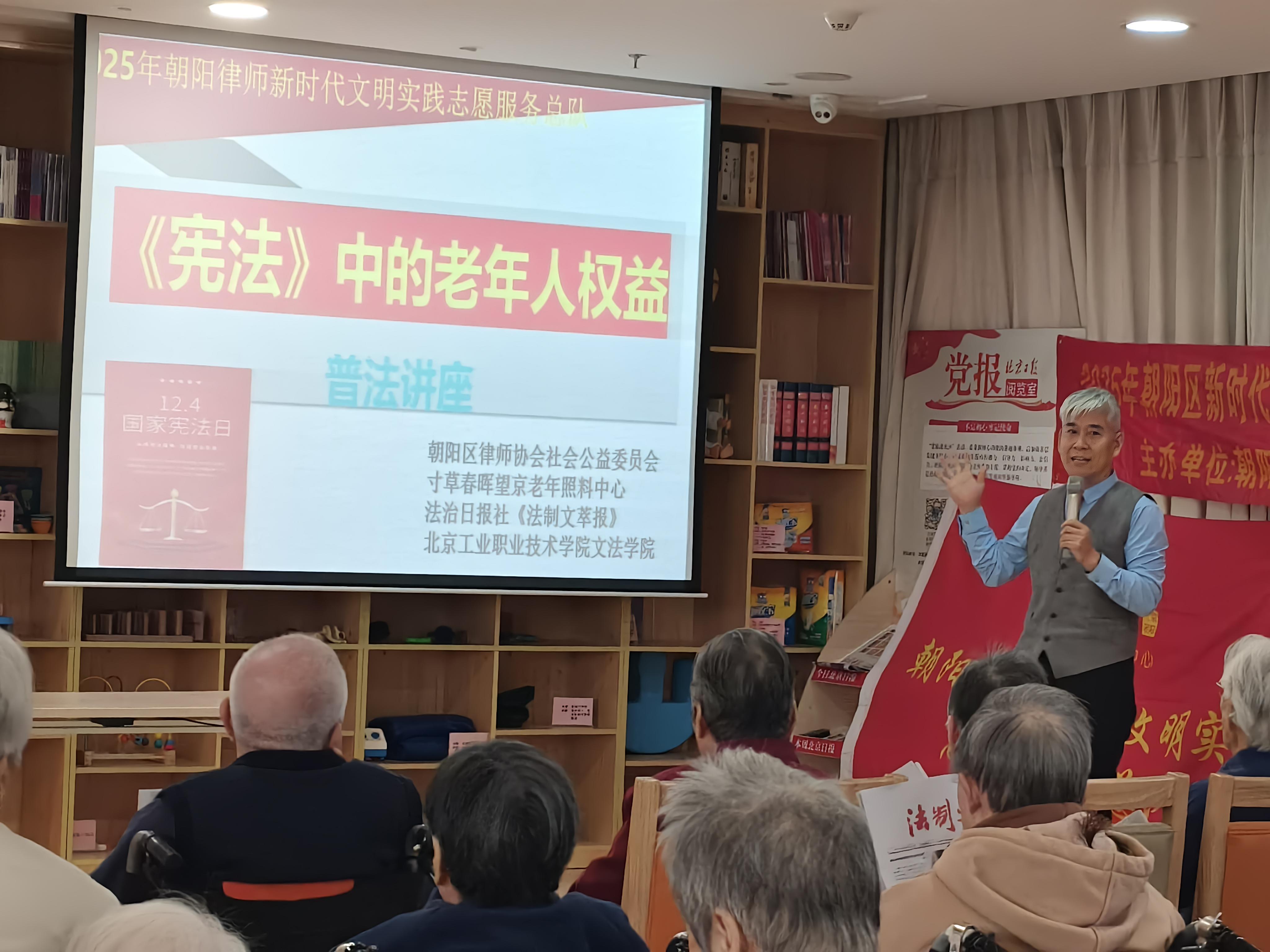 12月4日,在第十二個國家憲法日當(dāng)天,法治日報社《法制文萃報》攜手北京市朝陽區(qū)律師協(xié)會公益與社會責(zé)任委員會律師團(tuán)、北京工業(yè)職業(yè)技術(shù)學(xué)院文法與管理學(xué)院師生,走進(jìn)寸草春暉望京老年公寓,以“弘揚(yáng)憲法精神,維護(hù)老年人權(quán)益”為主題開展公益普法活動,旨在讓法治服務(wù)觸手可及,讓憲法精神浸潤老年生活。