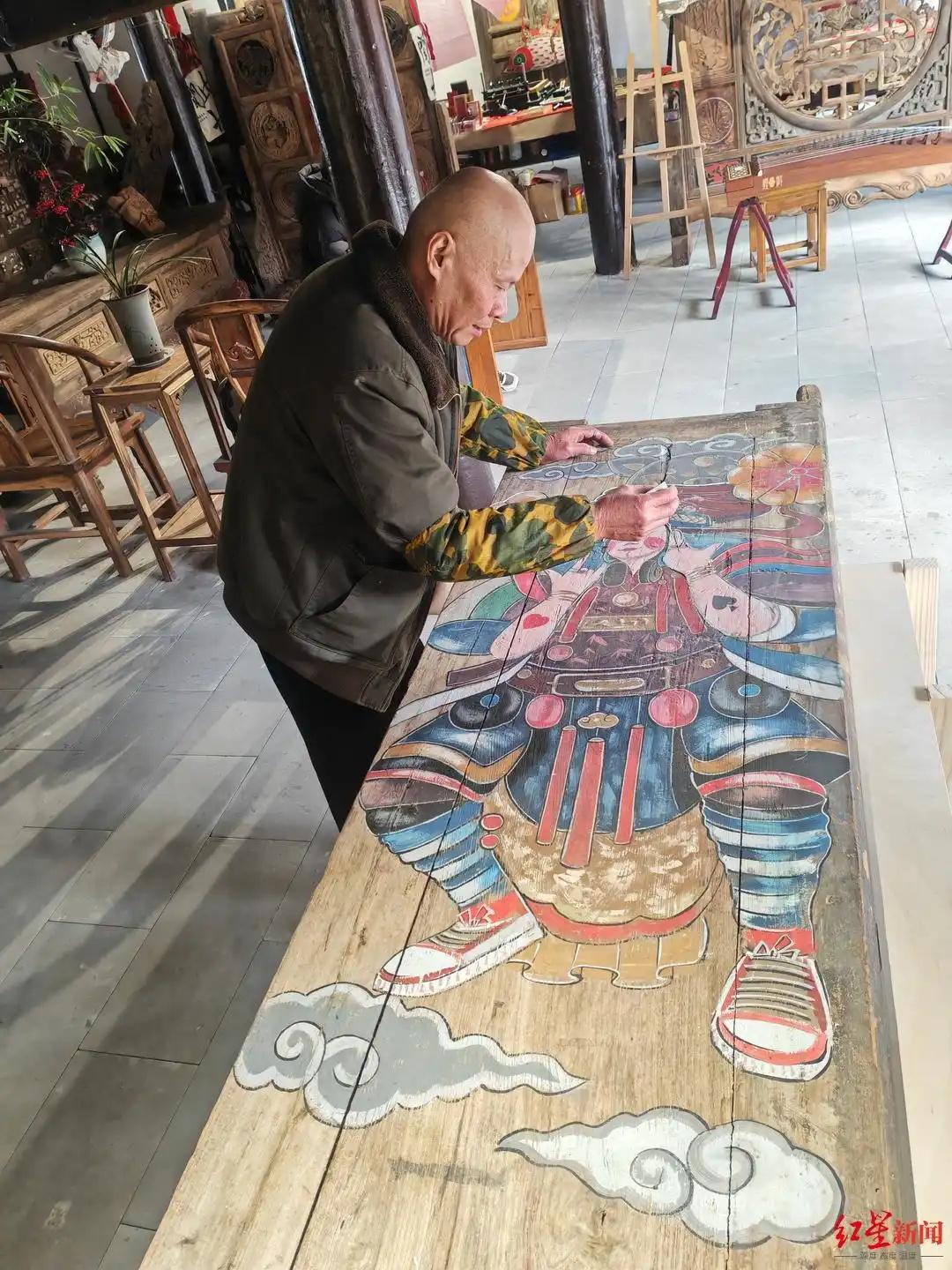 2月10日上午,“萬(wàn)千氣象看四川”大型主題采訪活動(dòng)走進(jìn)四川南充市閬中古城,在古城北街的門神畫展示中心,省級(jí)非物質(zhì)文化遺產(chǎn)“閬中門神畫”傳承人張桅正在店里一塊木門板上創(chuàng)作門神畫。不同于很多地方是貼門神畫,閬中的門神是直接“畫”到大門上去的,色澤古樸,栩栩如生。