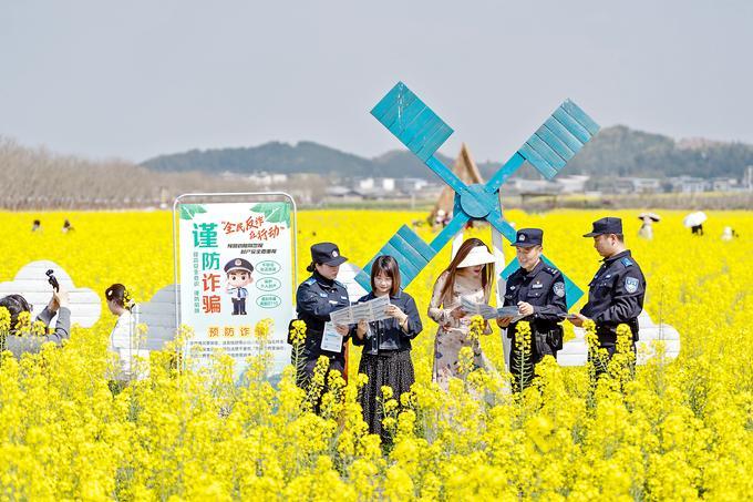 暖風(fēng)和煦,金波蕩漾。近日,四川省綿陽(yáng)市涪城區(qū)楊家鎮(zhèn)的千畝油菜花迎來(lái)盛放期,宛如金色海洋,吸引無(wú)數(shù)市民游客奔赴這場(chǎng)春日之約。在如畫(huà)美景中,一抹抹流動(dòng)的“藏藍(lán)”成為獨(dú)特而安心的風(fēng)景——綿陽(yáng)市公安局涪城區(qū)分局的民警輔警,將反詐宣傳的“課堂”搬到了田間地頭,讓平安守護(hù)與盎然春意相伴相融。