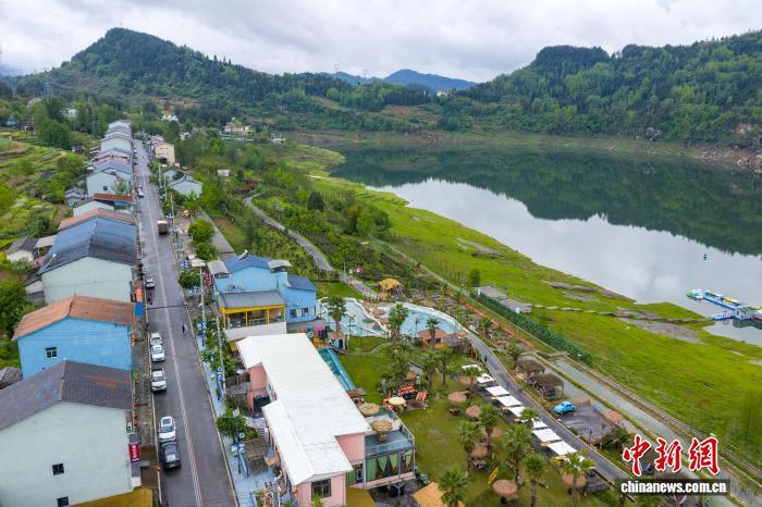 圖為重慶石柱橋頭鎮(zhèn)長沙村,一排排精品民宿立于湖光山色間。中新網記者 何蓬磊 攝