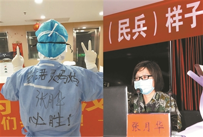 圖為張?jiān)氯A身著防護(hù)服在抗疫一線支援。右圖為張?jiān)氯A正在人武部做報(bào)告。周曉明 攝
