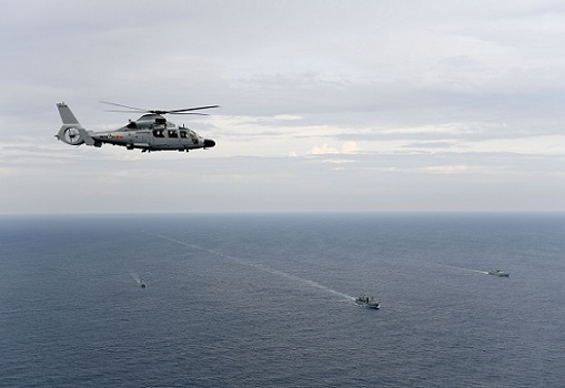 圖為5月14日,海軍第35批護航編隊進行艦機協(xié)同訓(xùn)練。 江山 攝