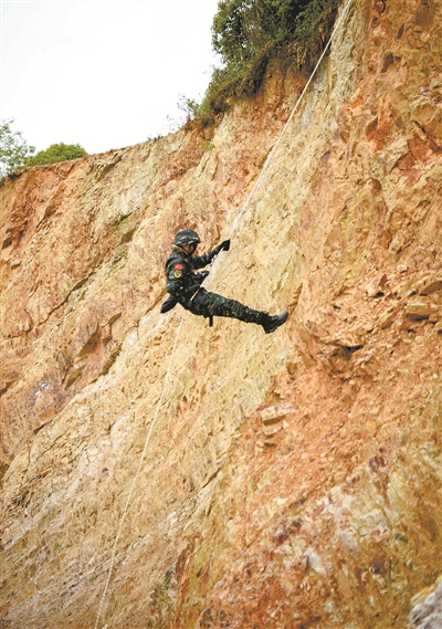 圖為特戰(zhàn)隊(duì)員實(shí)施索降,迂回圍剿“暴恐分子”。