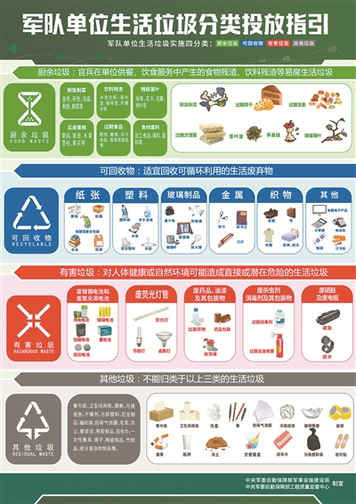 負(fù)責(zé)人:軍隊(duì)單位生活垃圾分類是指軍事區(qū)域內(nèi)人員按相應(yīng)規(guī)定將生活垃圾分類投放、分類收集、分類運(yùn)輸和分類處理,降低生活垃圾的處置量,提高可回收物質(zhì)資源化利用率,減少對(duì)環(huán)境的污染,落實(shí)國(guó)家堅(jiān)持節(jié)約資源和保護(hù)環(huán)境的基本國(guó)策。